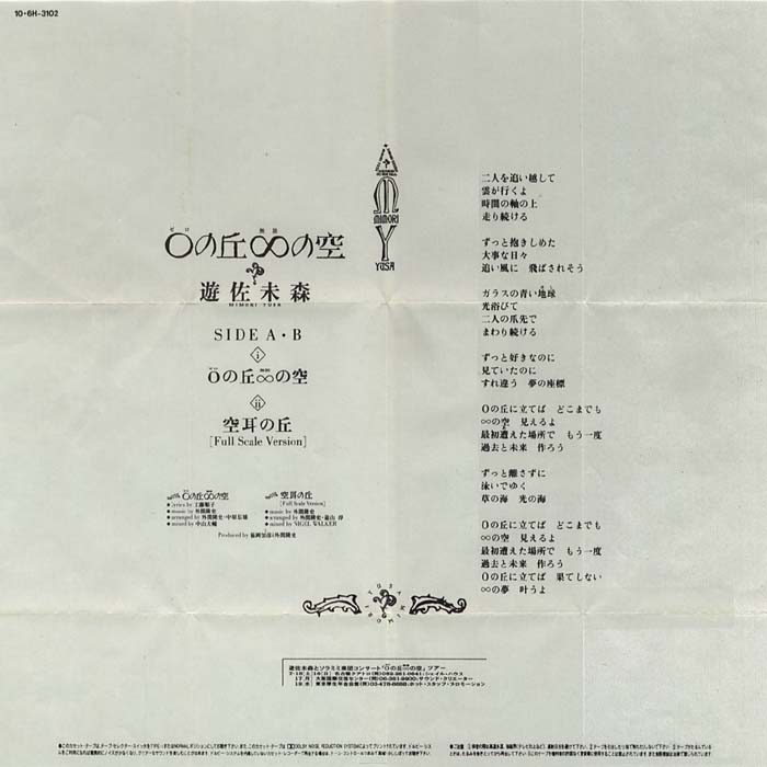 遊佐未森初期に発売されたミュージックテープ。現存しているのは非常に珍しい。この作品以降はカセットテープでの供給は無くなっている。 ジャケット部分はCDsと同一であるが、若干トリミングをして、天方向が短くなっている。カセットの方は天地方向が短いのでレイアウトも若干異なっている。 歌詞カードは折り畳まれているため、CDsよりも大変大きくなっている。 曲の収録順はCDsと同一であるが、「0の丘∞の空」「空耳の丘」を連続してA面に収録、B面も同様に収録となっている。 |